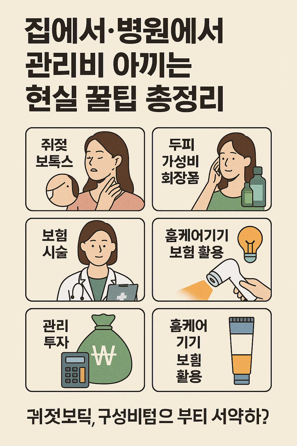 쥐젖, 보톡스, 두피, 가성비 화장품까지 — 피부관리비를 아끼면서 효과는 극대화하는 뷰티+금융형 피부관리 가이드입니다.(※ 시술·보험 정보는 참고용으로만 활용해주세요.) 🧴 1️⃣ 피부관리, 투자처럼 해야 하는 이유요즘 피부관리비 월 평균 20만 원 이상 쓰는 분들이 많아요.하지만 현명한 사람들은 ‘소비’가 아니라 ‘투자’로 관리합니다. 👉 쥐젖·편평사마귀 없애는 법 보러가기 💡 홈케어기기와 보험을 함께 활용하면 연간 60% 이상 절약 가능합니다.🩺 2️⃣ 병원 시술 전 꼭 알아야 할 보험 꿀팁시술 후 부작용이 생기면 치료비 부담이 크죠.이럴 땐 피부보험으로 관리비용을 보장받을 수 있습니다. 👉 보톡스 시술 후 주의사항 & 보험보상 총정리 ⚠️ 시술 후 24시간 이내 운동, 사우나, 세안은 절대..